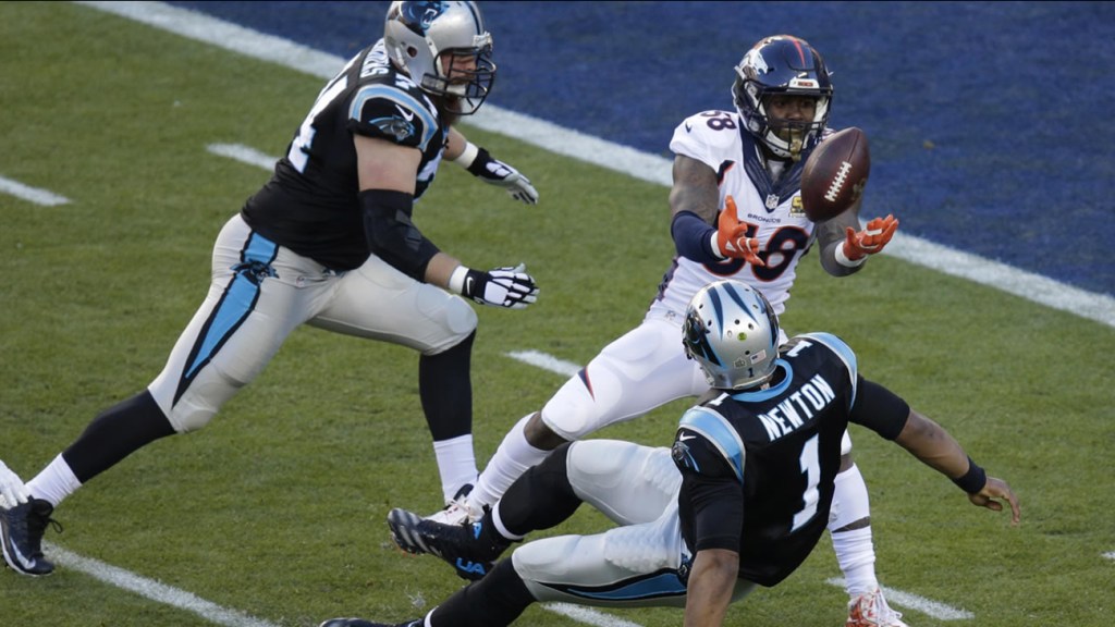 Como fue la constante durante toda la temporada, la defensiva de los Broncos se puso el equipo al hombro y anotó el primer touchdown gracias a una genialidad del linebacker Von Miller, que en una captura arrebató el balón a Cam Newton para que Malik Jackson recogiera el ovoide en la zona de anotación poniendo el marcador 10-0. La respuesta de las Panteras no se hizo esperar, y después de un par de drives se acercaron en la pizarra con un acarreo de una yarda de Jonathan Stewart.