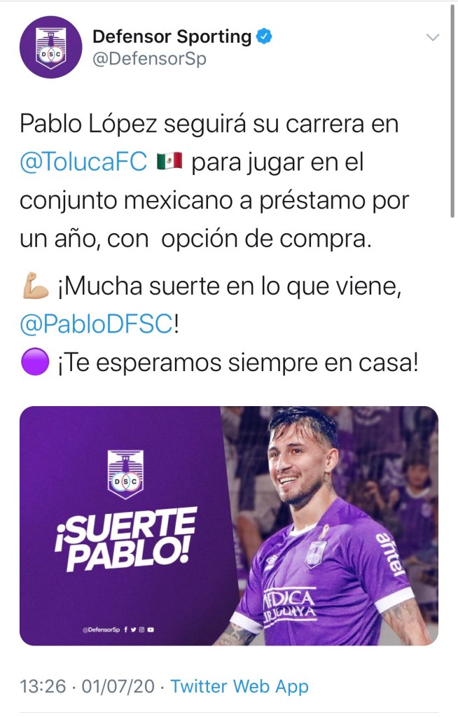 «Pablo López seguirá su carrera en @TolucaFC para jugar en el conjunto mexicano a préstamo por un año, con opción de compra. Mucha suerte en lo que viene!. ¡Te esperamos siempre en casa!», se comentó en el anuncio a través de sus redes.
