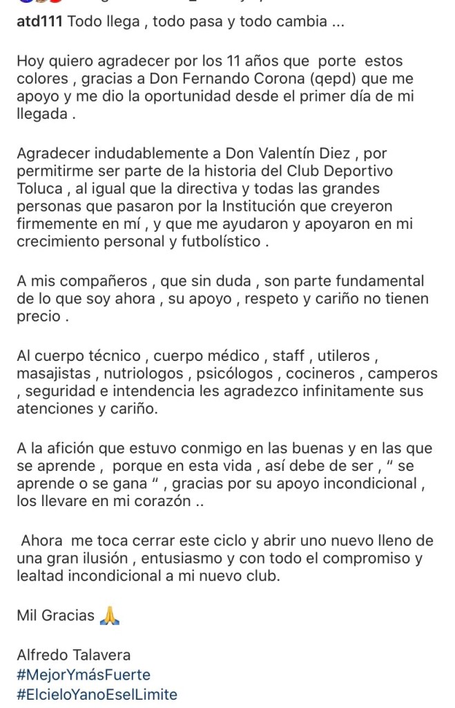“¡Gracias, Alfredo Talavera, por defender nuestro escudo y cuidar siempre de nuestra portería!”, escribió la gente del club mexiquense.