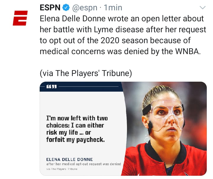La MVP Elena Delle Donne, jugadora de Washington Mystics, y dos veces MVP de la Women’s National Basketball Association por sus siglas WNBA, está siendo obligada a jugar a pesar de encontrarse enferma.
