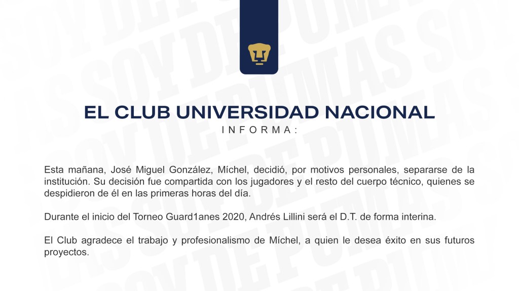Este día jueves 23 de julio en punto de las 10:15 am. el Club Universidad Nacional por medio de su cuenta de Twitter permitió al estratega español Miguel González «Míchel» lanzar un comunicado a la afición universitaria en el cual anuncia su renuncia a la dirección técnica del club.