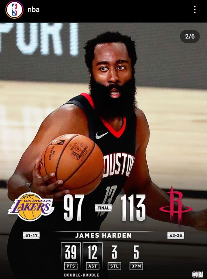 En un juego esperado por muchos y lo que puede ser un adelanto de Playoff, dado el poder ofencivo que pueden ofrecer los equipos, los Houston Rockets ganarón a los Angeles Lakers, por un marcador de 113-97. Westbrook y Lebron no tuvieron participación en el encuentro, ambos por lesión.