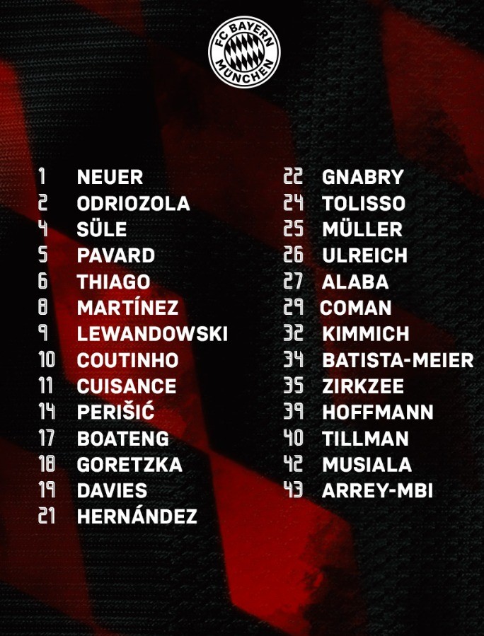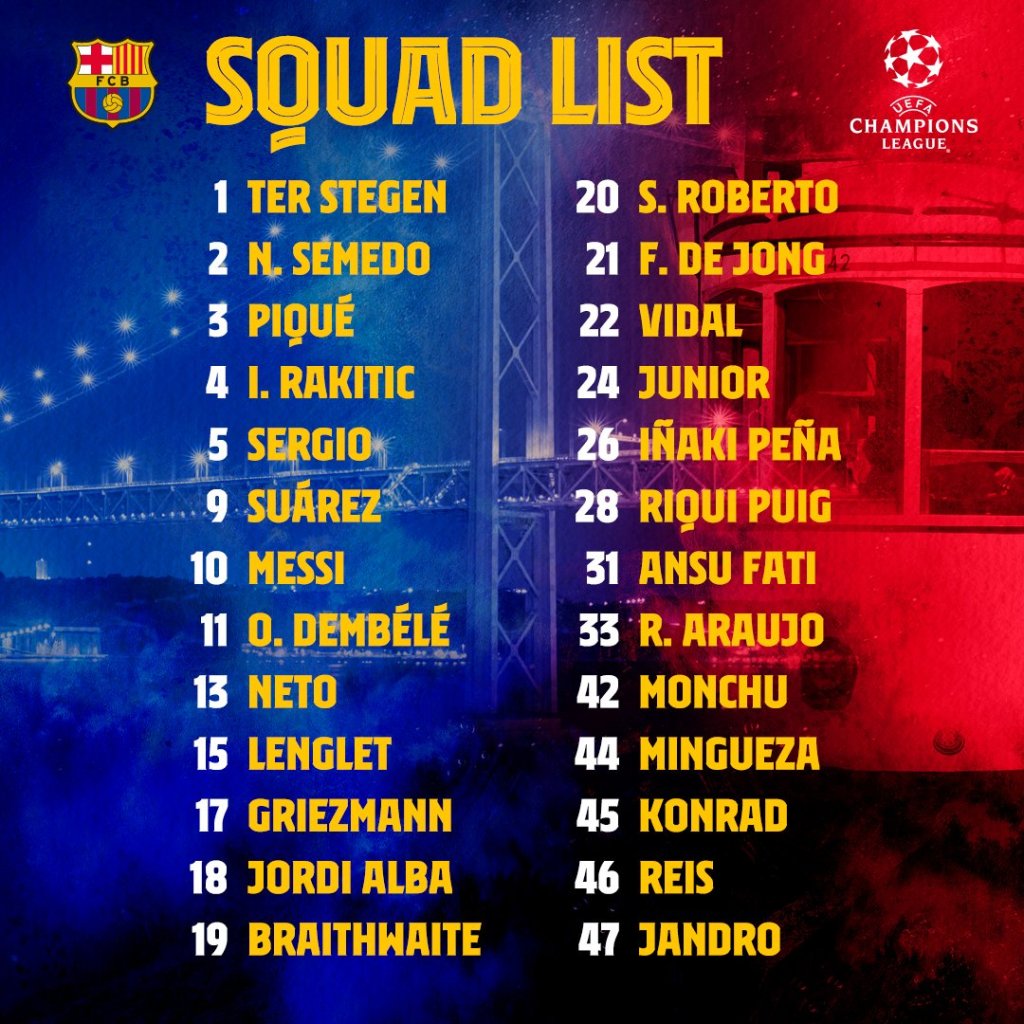 El Barcelona encaró la vuelta de los octavos con las ausencias de Sergio Busquets y Arturo Vidal por sanción, además de la de Ousmane Dembelé por lesión; los tres jugadores estarán disponibles para disputar el encuentro ante el Bayern. Del lado de los alemanes, a pesar de que entró en la convocatoria, el lateral francés Benjamin Pavard no se recuperó por completo de su lesión de ligamentos, por lo que no podrá ser tomado en cuenta por Hansi Flick para este compromiso.