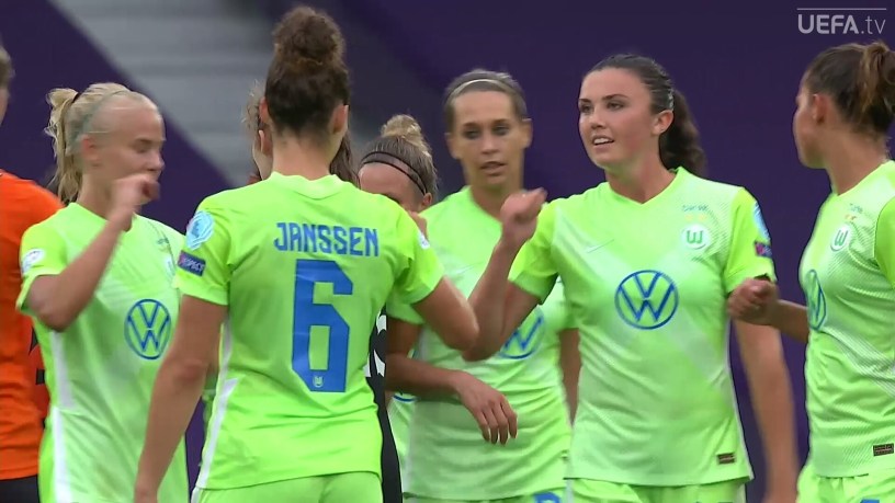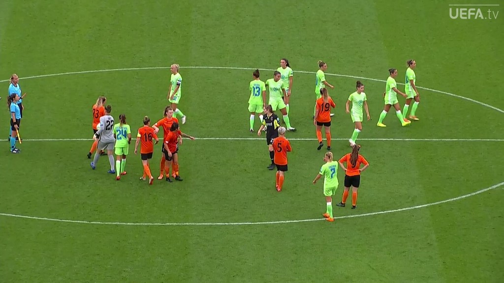 Poco antes de terminar el primer tiempo, las jugadoras de Wolsburg atacaron y al 44’, por el lado derecho hubo un centro que Engen mandó al fondo de la red y marcó su segundo gol del encuentro. En el tiempo agregado, al 40+2, hubo un tiro libre que no se cobró directo, se hizo un pase a Harder, que no tenía marca y con un potente disparo mandó al dentro de la portería. Terminó el primer tiempo con un 0-4.
