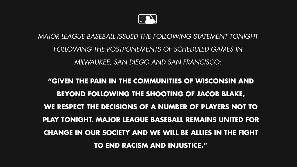 Minutos más tarde, la organización de la Major League Baseball (MLB) externó su compromiso de respetar la decisión de los peloteros y su postura en contra del racismo y la injusticia, a la que se sumaron la postergación de los juegos de Seattle Mariners vs San Diego Padres y Los Angeles Dodgers vs San Francisco Giants.