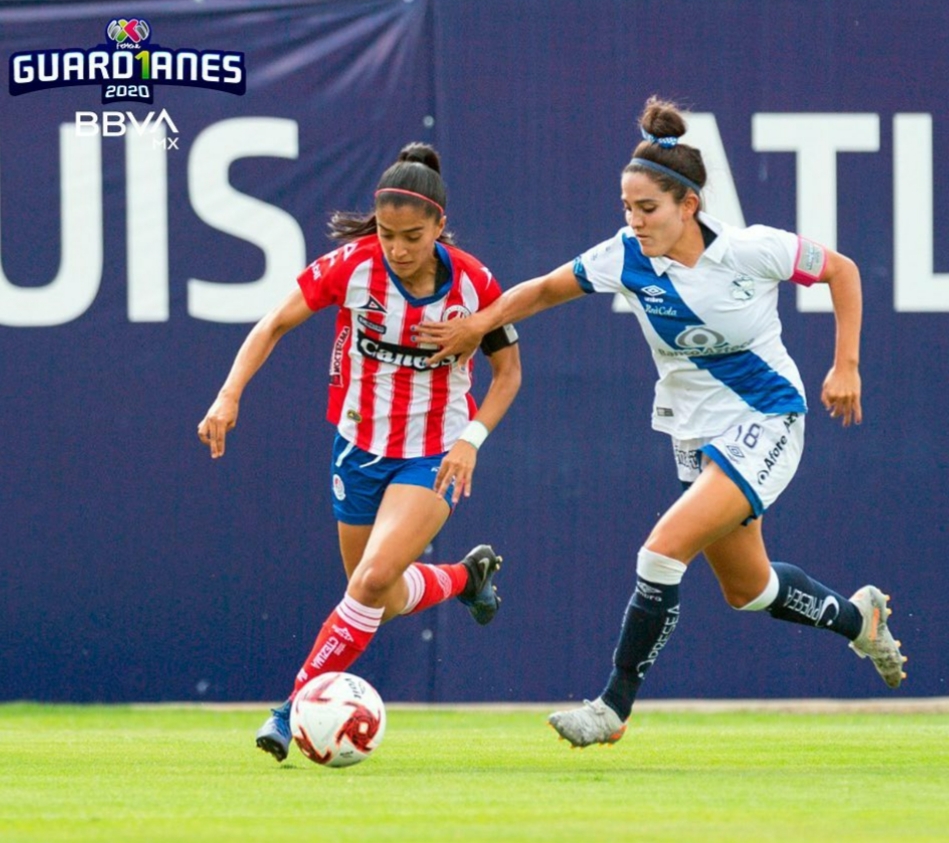 El partido dio inicio, y ambas escuadras trataron de imponerse primero en el campo. Las contenciones poblanas, Morán y Anguiano, repartían balones de forma eficaz, pero el sector defensivo de las Potosinas estaba muy bien parado, muy bien organizado. Estaba siendo una primera mitad muy cerrada, cuando al minuto 16′, Kasis aprovecha un error defensivo de las poblanas y mete un auténtico golazo. Final del primer tiempo, 1-0 a favor del Atlético de San Luis.