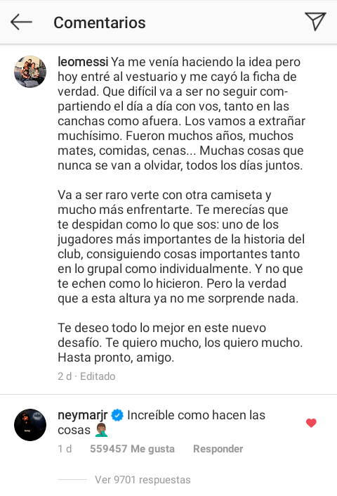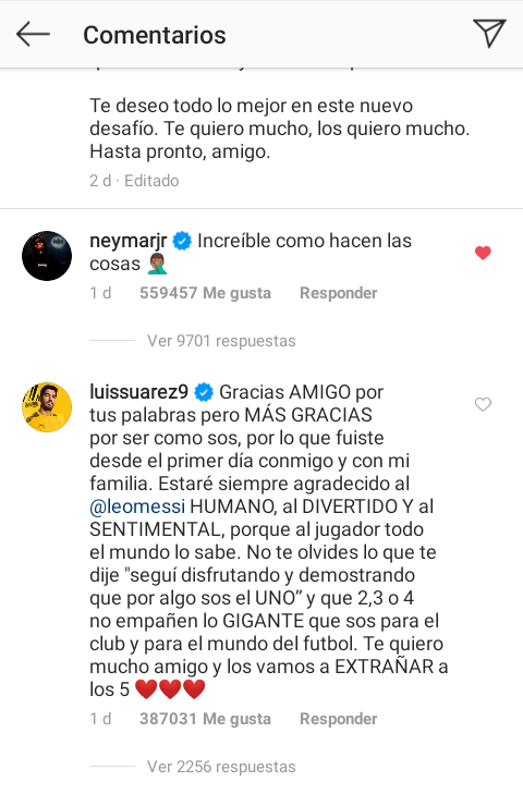 Leo Messi dedicó un post de Instagram para despedirse de su amigo y excompañero Luis Suárez. Pero dentro de sus palabras incluyó dardos en contra de Bartomeu y su junta directiva, a las cuales se les agregaron varias críticas en los comentarios por parte de ex jugadores del equipo catalán: