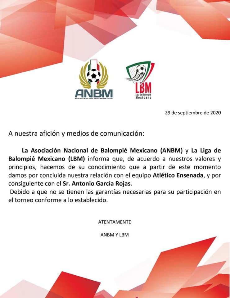 “Antonio se comunicó directamente conmigo para decirme que Ensenada está fuera de la LBM y en las próximas horas saldrá un comunicado oficial. Me están sacando porque no quiero jugar el torneo POR TI. Inmediatamente le marco a Víctor Montiel (presidente de la Asociación Nacional de Balompié Mexicano), para corroborar esta información, y me lo confirmó”, afirma.