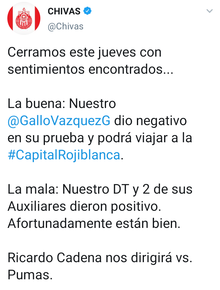 El día de ayer, a través de redes sociales, las Chivas de Guadalajara dieron a conocer que el cuerpo técnico del club sufrió contagio y ha sido apartado de acuerdo al protocolo.