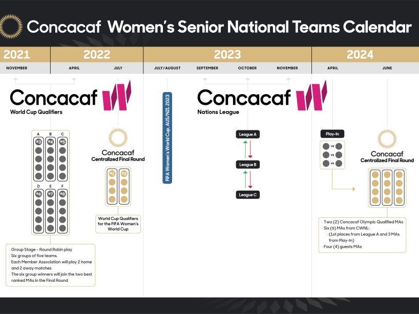 Durante julio 2022, los 8 equipos finalistas disputarán entre sí por el lugar que otorgará la Concacaf para el mundial. Por su parte, por primera ocasión la Confederación efectuará una Nations League femenil, donde los países miembros se dividirán en grupos en tres ligas, al igual que el formato varonil.