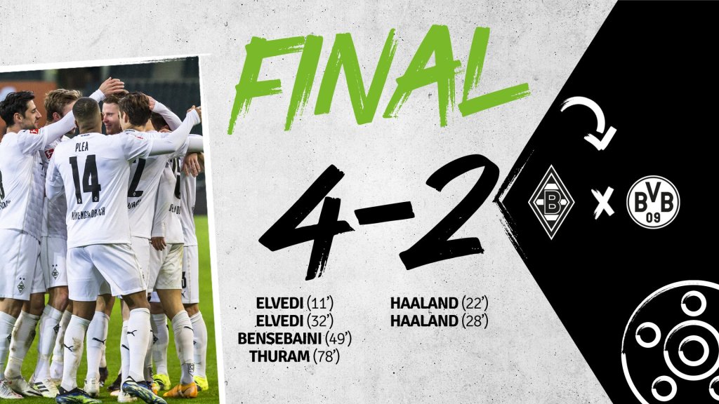 Con este resultado, Monchengladbach supera en la tabla a Dortmund, que vuelve a perder a pesar de su magnifica combinación en ofensiva entre Sancho y Haaland.