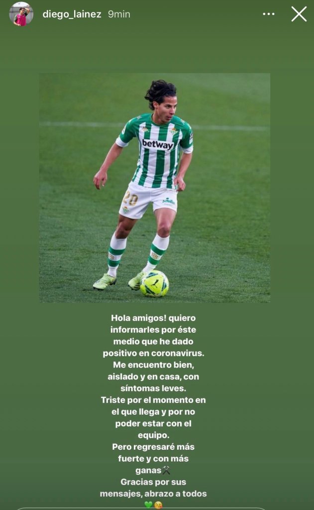 «Hola amigos, quiero informarles por este medio que he dado positivo a coronavirus. Me encuentro bien, aislado y en casa, con síntomas leves. Triste por el momento en el que llega y por no poder estar en el equipo», publico Lainez.