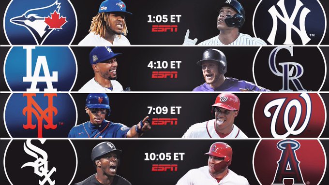 No obstante el actual campeón Dodgers de los Ángeles iniciará la defensa de su título como local ante los Rockies de Colorado a las 16:10, otro de los partidos atractivos del primer día de actividad de Grandes Ligas será la visita de los Ángeles Angels al U.S. Cellular Field de los Medias Blancas de Chicago además del New York Mets contra Washington Nationals.