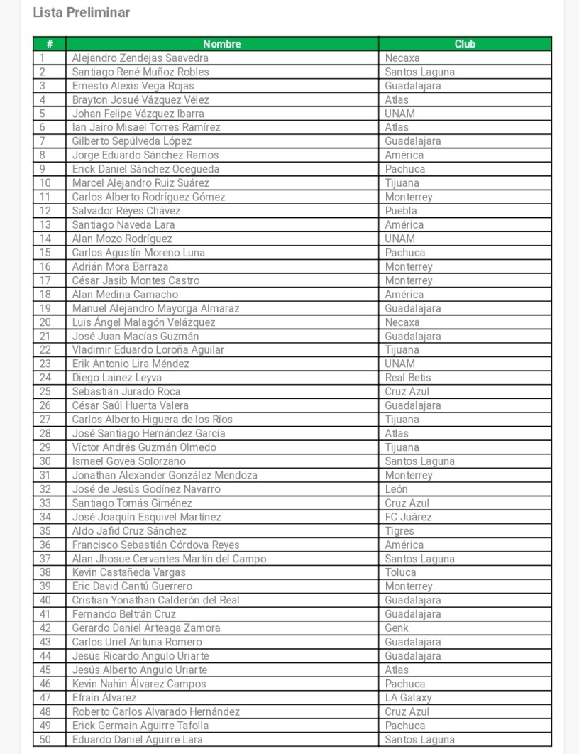 Dentro de esta lista resaltan varios nombres. Entre ellos están: Diego Lainez y Gerardo Arteaga, los únicos dos que militan equipos del extranjero.