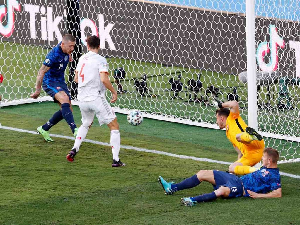 Para poner el último clavo en el ataúd con otro tiro de esquina en el costado derecho, el ataque español pondría el esférico en el área, tras una serie de rebotes la pelota quedaría volando, Laporte remataría de nueva cuenta y el balón encontraría a Pau Torres que choco el balón que iba en dirección a cruzar la linea de gol, en su desesperación el mediocampista Juraj Kucka intentaría despejar el esférico pero terminaría empujándola a sus redes para meter su segundo autogol en el partido y hacer una manita, ganaba España 0-5.