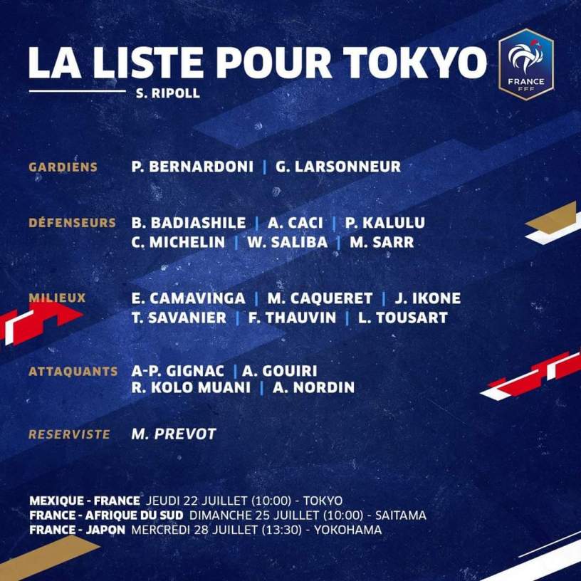 Dentro de estos nombres destaca la presencia de André-Pierre Gignag y de Florian Thauvin, elementos de los Tigres de la Universidad, ambos llegan en calidad de refuerzos para la competición veraniega su entrenador Pierre Mankowski los ha considerado para hacer historia en Tokio.