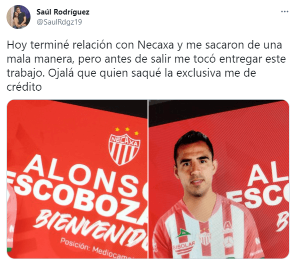 Recién ePrimero, el 1 de julio el Club América le daba las gracias Alonso Escoboza, después el futbolista sin haber firmado previamente un contrato se unió a la pretemporada del Necaxa, o al menos esto era lo que indicaban los rumores de diversos medios que siguen de cerca a los “hidrorrayos”, ahora, Saúl Rodríguez, supuestamente exempleado y exdiseñador del equipo de Aguascalientes filtró la imagen con la que al parecer Escboza sería presentado de vuelta en la institución.