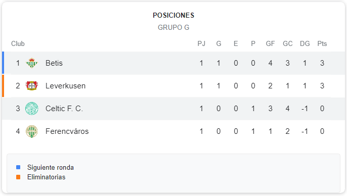 Con este resultado, el Real Betis se colocó como líder del grupo “G” junto al Bayern Leverkusen que también ganó en su respectivo encuentro contra el Ferencvárosi Torna Club. Por su parte, el Celtic con esta derrota deberá iniciar desde el fondo de la tabla.