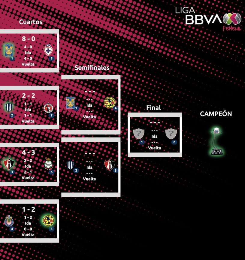 Dos equipos regios, uno capitalino y uno tapatío jugarán las semifinales. Tigres irá contra América y Rayadas contra Atlas. Existe la posibilidad de que haya al menos un equipo regio en la final.